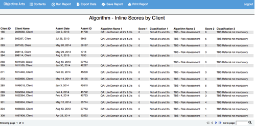 Predecessor to the Algorithm – Inline Scores by Client report below.  This roport groups multiple algorithm scores for a client into a group of rows with one row per algorithm score/classification.  Row groups are sorted by client Id.